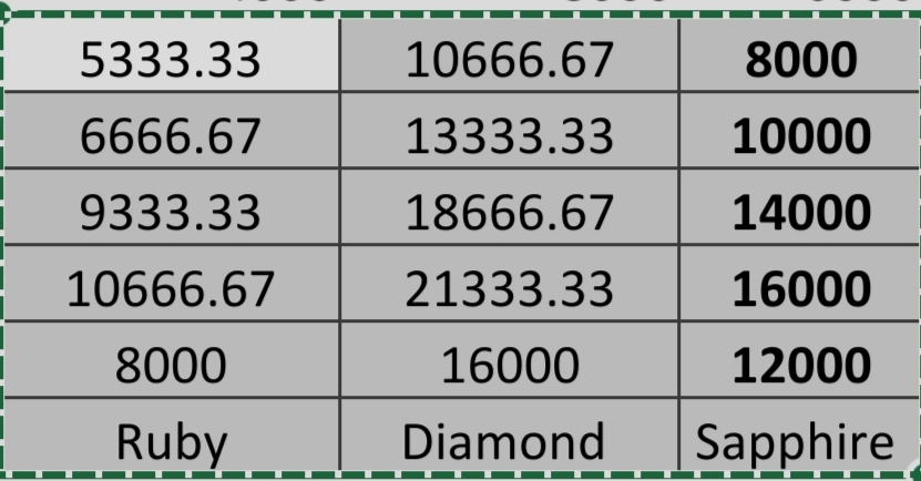 Diamond = $8,000, Sapphire = $14,000, and Ruby = $12,000